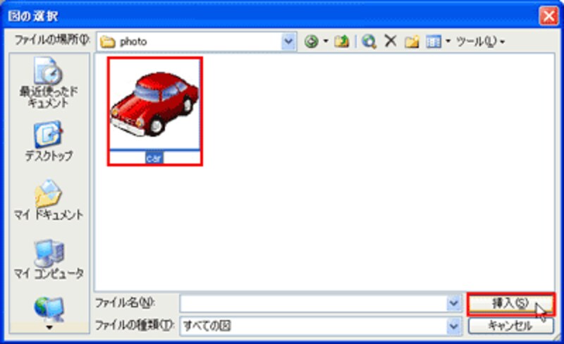 「図の選択」ダイアログボックスで、最初に保存しておいたイラストを選択し、「挿入」ボタンをクリックします。