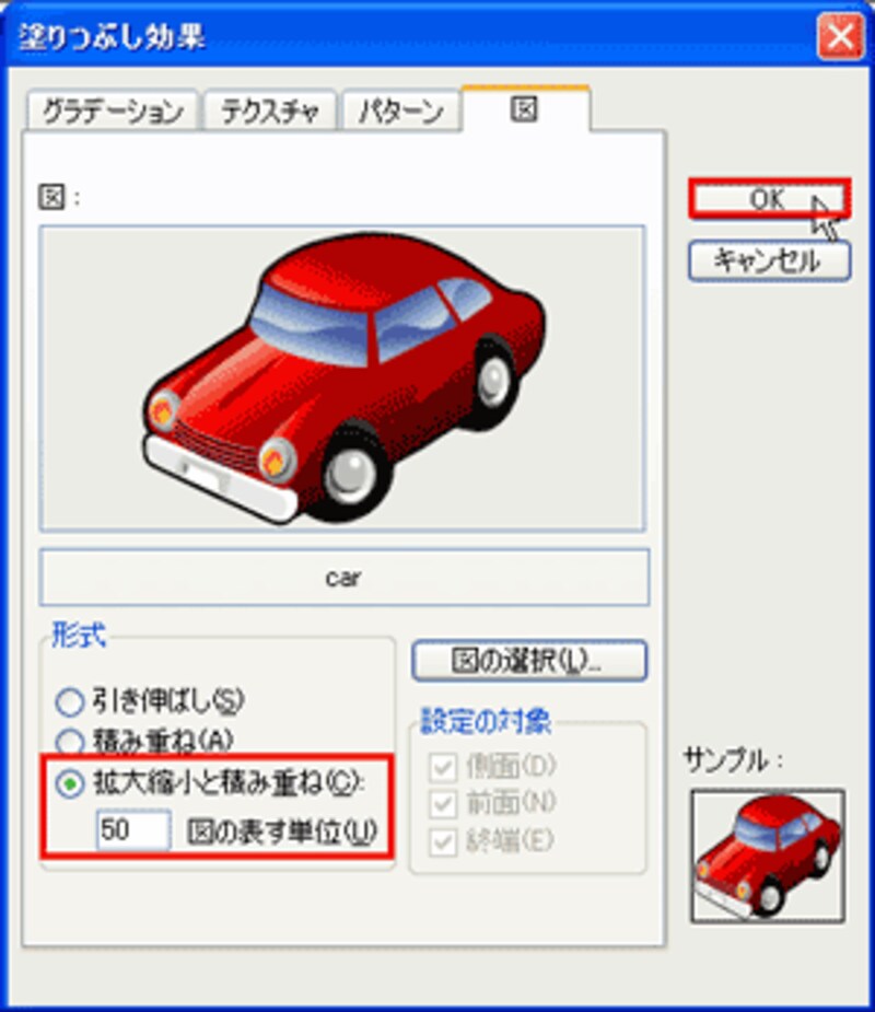 「塗りつぶし効果」ダイアログボックスに戻って、指定したイラストが表示されることを確認したら、下部の「形式」を変更します。ここでは、1つの車のイラストを50台分として表したいので、「拡大縮小と積み重ね」を選択し、「図の表す単位」を「50」に設定して「OK」ボタンをクリックします。