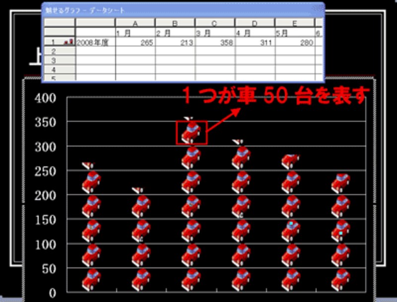 「データ系列の書式設定」ダイアログボックスに戻ったら「OK」ボタンをクリックします。これで、イラスト1つが50台を表す絵グラフが作成できました