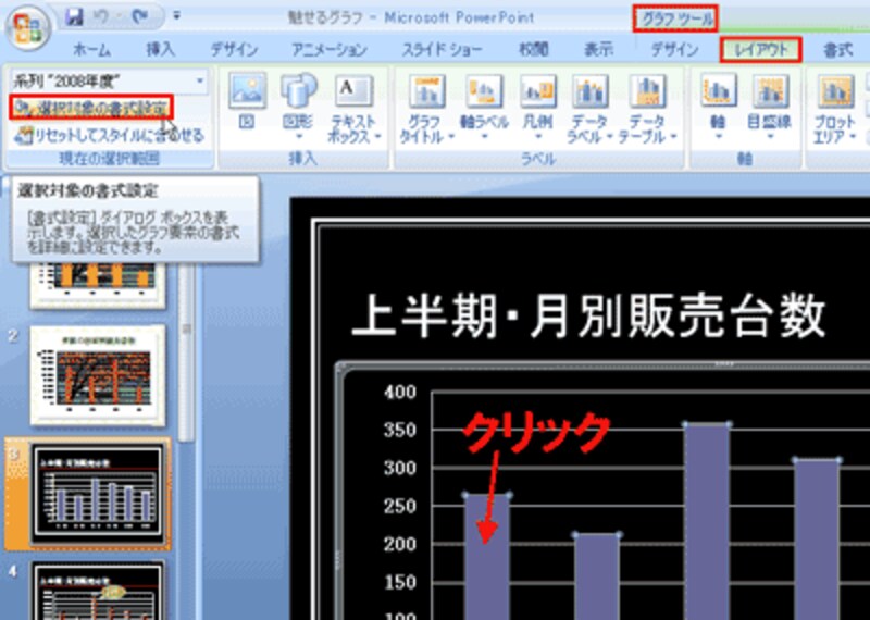 保存したイラスを積み上げるときは、棒の中をクリックし、「グラフツール」-「レイアウト」タブの「選択対象の書式設定」ボタンをクリックします。