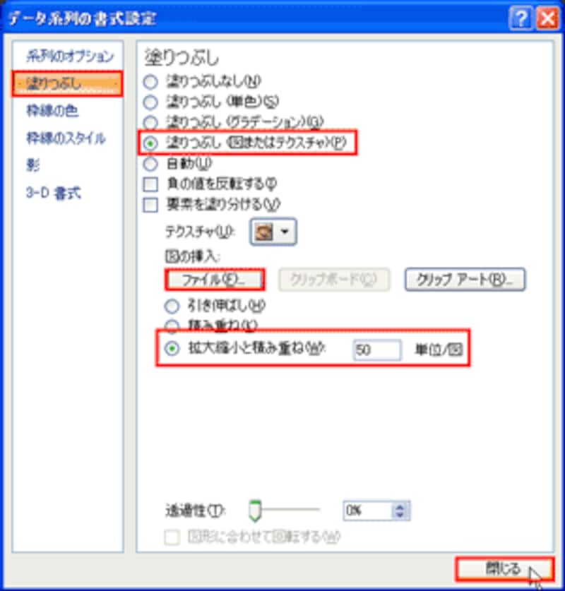 「データ系列の書式設定」ダイアログボックスが表示されたら、左側から「塗りつぶし」を選択し、右側の「塗りつぶし(図またはテクスチャ)」をクリックします。続いて「ファイル」ボタンをクリックして保存済みのイラストを指定します。最後に、「拡大縮小と積み重ね」と単位を指定して「閉じる」ボタンをクリックします。