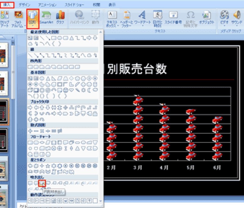 なお、PowerPoint2007で吹き出しの図形を描くときは、「挿入」タブの「図形」ボタンをクリックし、一覧から「丸型吹き出し」をクリックします。