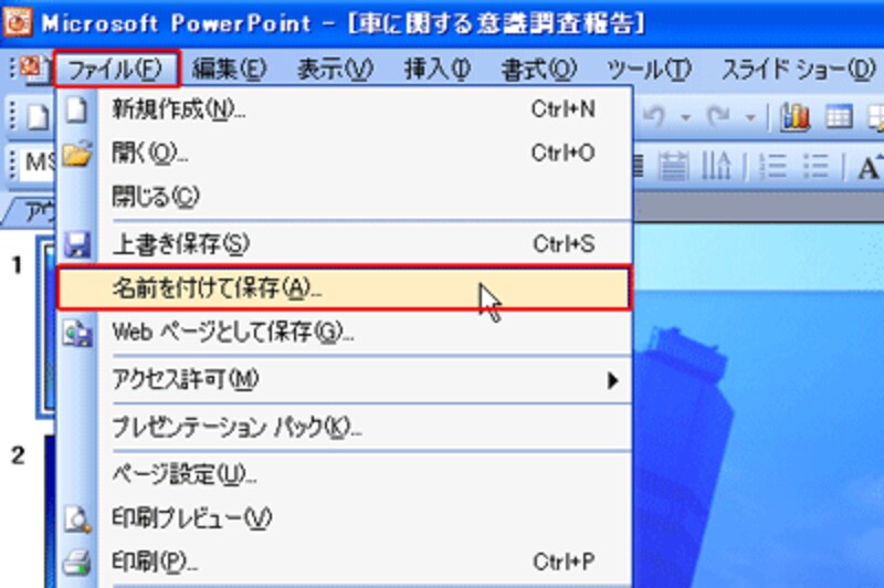 ダブルクリックするだけでスライドショーを実行するには、「プレゼンテーションファイル」ではなく「スライドショー形式」で保存するのがポイントです。早速やってみましょう。まず、「ファイル」メニューの「名前を付けて保存」をクリックし、「名前を付けて保存」ダイアログボックスを開きます。