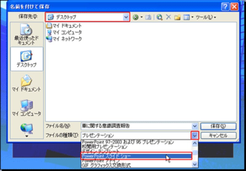 2つ目は「ファイルの種類」。「ファイルの種類」の▼ボタンをクリックし、表示される一覧から「PowerPointスライドショー」を選びます。あとは、「ファイル名」を入力して「保存」ボタンを押すだけでOKです。