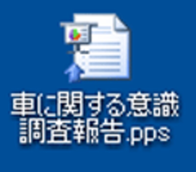 保存先のデスクトップには、以下のような絵柄のアイコンが表示されます。プレゼンテーションファイルとして保存したアイコンの絵柄と違うことが確認できますね。これが、スライドショー形式で保存したPowerPointのファイルで、「.pps」の拡張子が付与されます。![]() |