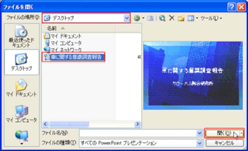 「ファイルを開く」ダイアログボックスで、デスクトップに保存したスライドショー形式のファイルを指定して「開く」ボタンをクリックします。