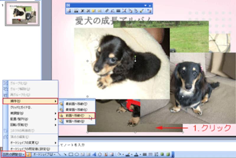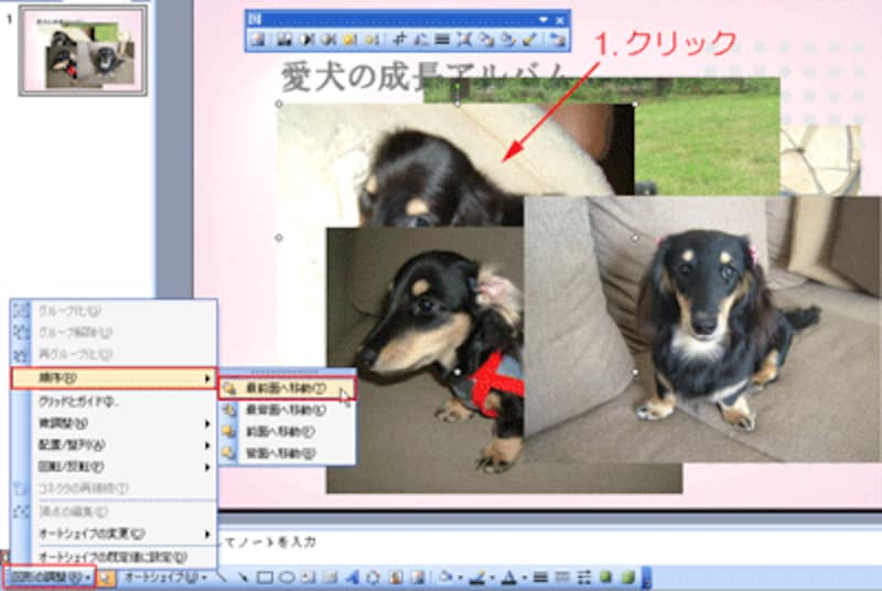 選択した写真が一番下側に回りこみました。次に、一番上側(成長過程の最初)に表示したい写真をクリックして選択し、「図形描画」ツールバーの「図形の調整」→「順序」→「最前面へ移動」をクリックします。
