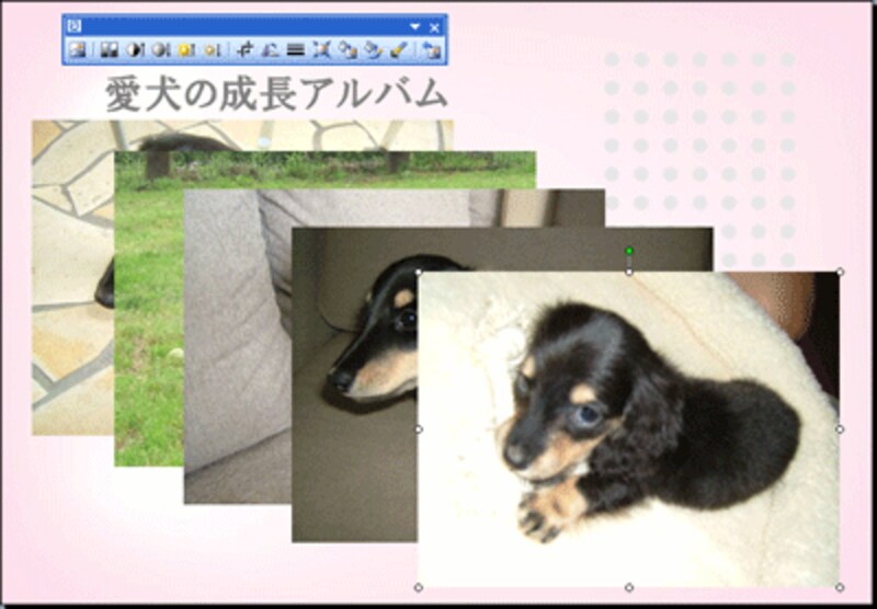 選択した写真が一番上側に表示されました。他の写真は、「図形描画」ツールバーの「図形の調整」→「順序」→「前面へ移動」や「背面へ移動」をクリックして1枚ずつ重なりを調整します。