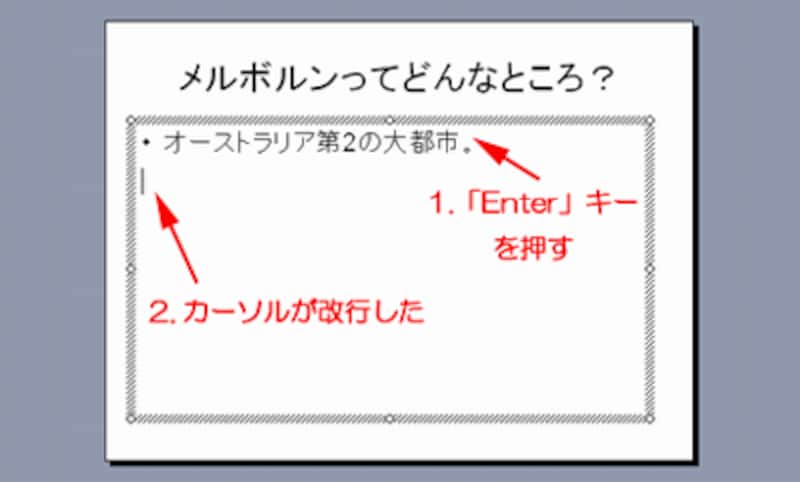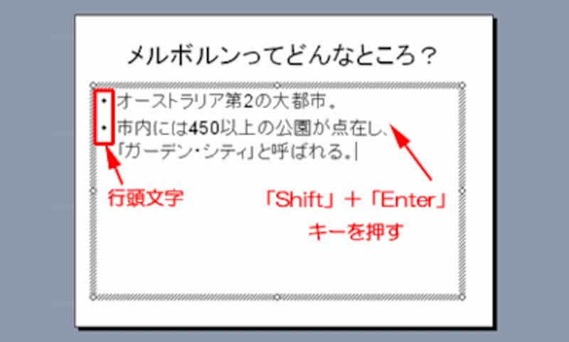 「Enter」キーで改行すると、先頭に箇条書きを区別する「行頭文字」と呼ばれる記号が自動的に表示されます。もし、行頭文字を付けずに改行したいのであれば、改行時に「Shift」キーを押しながら「Enter」キーを押します。少し長めの箇条書きであれば、これで対応できますね。