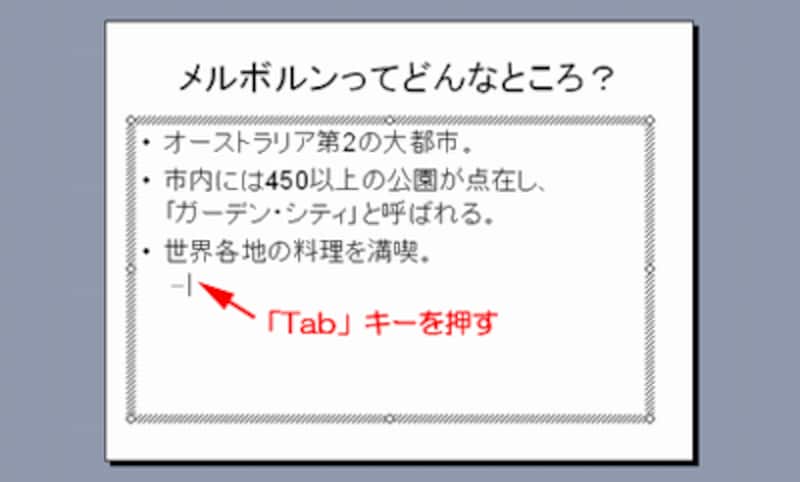 箇条書きの中に含まれる内容は、文字の先頭位置を右にずらしてから入力すると、階層関係がはっきりします。それには、新しい行で「Tab」キーを押すと、自動的にカーソルの位置が右にずれます。![]() |