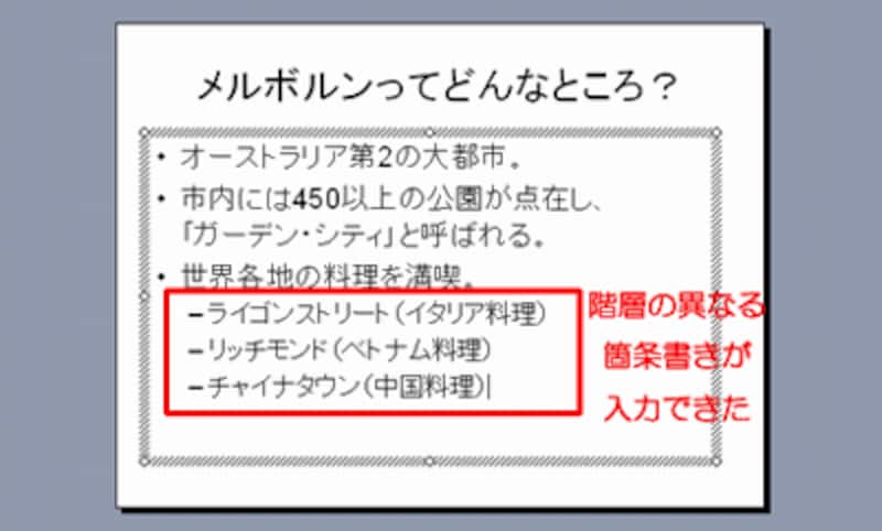 階層のある箇条書きが入力できました。反対に、文字の階層を上げて先頭位置を左にずらすときは、「Shift」キーを押しながら「Tab」キーを押します。PowerPointでは、全部で5段階の階層を設定できます。