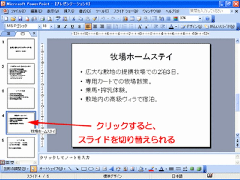 スライドの追加と文字の入力を繰り返せば、文字だけのシンプルな資料のできあがりです。作成したスライドは、左側の「スライド一覧」タブに縮小表示され、目的のスライドをクリックすると、中央に表示されるスライドが切り替わります。スライドに入力した内容をじっくり確認しておきましょう。![]() |