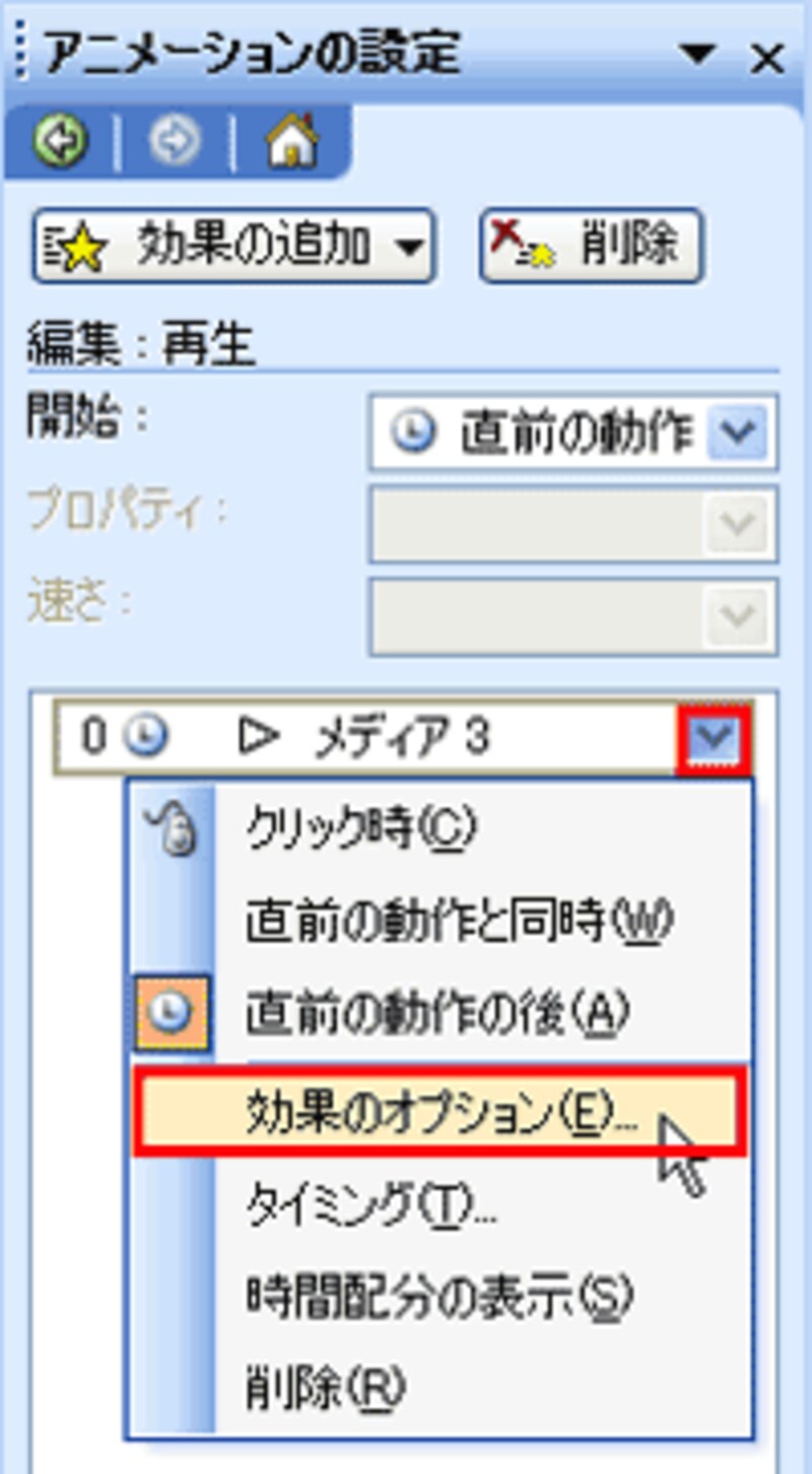 画面の右側に「アニメーションの設定」作業ウィンドウが表示されたら、「メディア」と表示された右側の▼ボタンをクリックし、一覧から「効果のオプション」をクリックします。