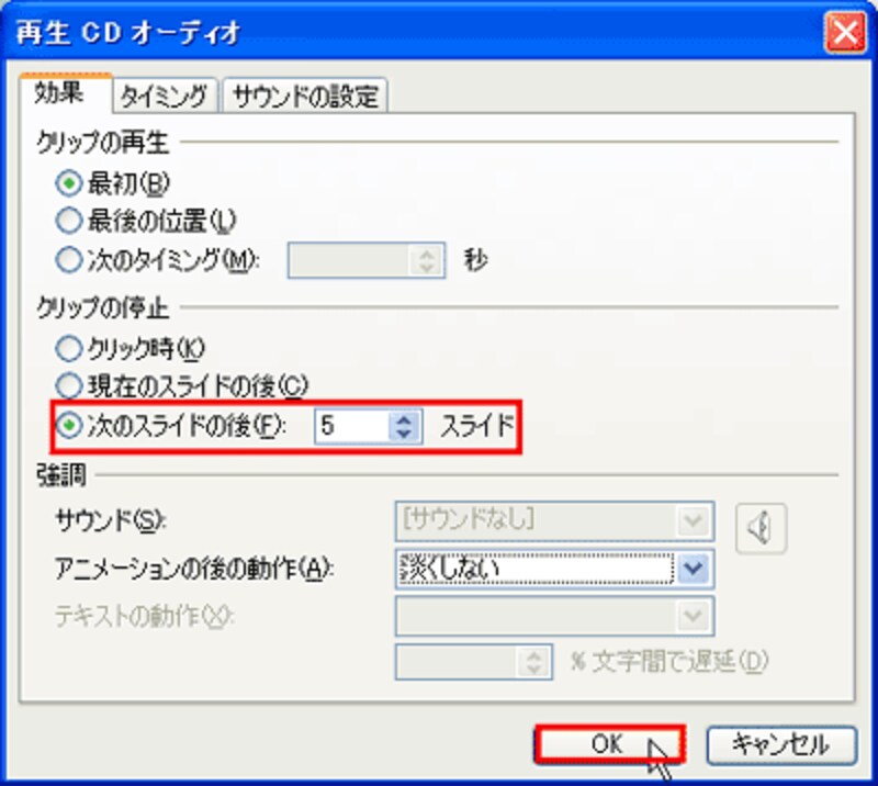 「再生CDオーディオ」ダイアログボックスで、「クリップの停止」を「次のスライドの後」に変更し、最後のスライドの番号を指定します。