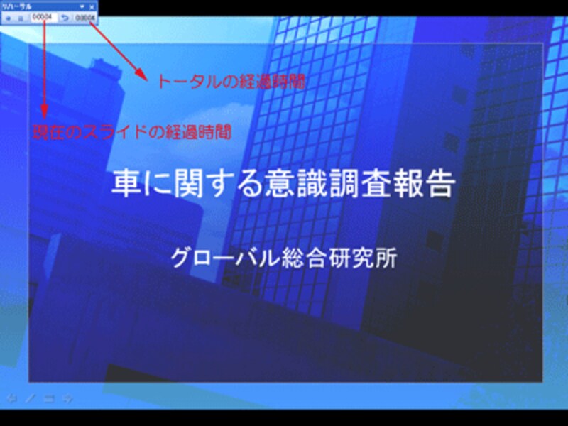 スライドショーが実行され、画面左上に「スライドショー」ツールバーが表示されました。このツールバーは、タイマー機能を備えており、現在表示中のスライドの経過時間と、トータルの経過時間が表示されるようになっています。