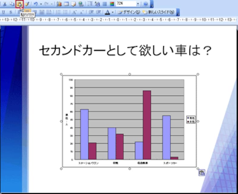次にPowerPointに切り替え、グラフを貼り付けたいスライドを表示します。続けてツールバーの「貼り付け」ボタンをクリックすると、コピーしておいたExcelのグラフが「Microsoft Excel グラフオブジェクト」として貼り付きます。