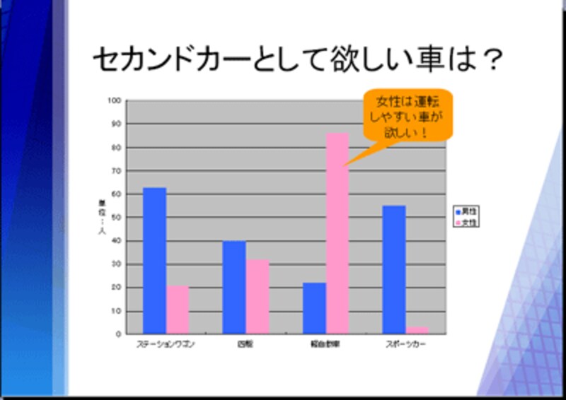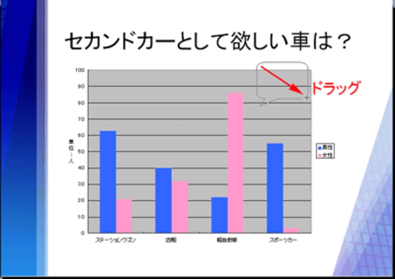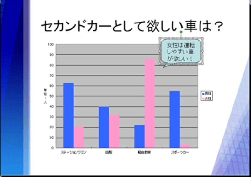 グラフの色合いを変更しただけでは完成ではありません。グラフの見方は千差万別。見る人によって注目する箇所が違うかもしれません。プレゼン用のグラフは、誰もが同じ見方をするように、伝えたいポイントを書き込んでおくことが大切です。ここでは「吹き出し」の図形を使って、図形の中にポイントを入力します。まず、グラフの外側をクリックしてグラフの編集状態を解除します。次に、「図形描画」ツールバーの「オートシェイプ」から「吹き出し」→「角丸四角形吹き出し」をクリックします。