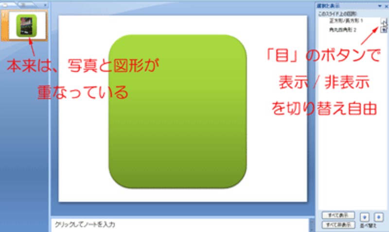| 「選択と表示」を使うと、図形の上に重ねた写真を一時的に非表示にできる |