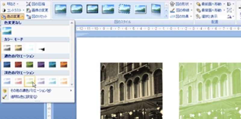 PowerPoint2007は、写真などの画像処理にも目を見張るものがあります。従来は、明るさの調整やトリミングなどのいくつかの編集機能以外は、PowerPointとは別に「Photoshop Elements」などの画像編集の専用ソフトが必要でした。
