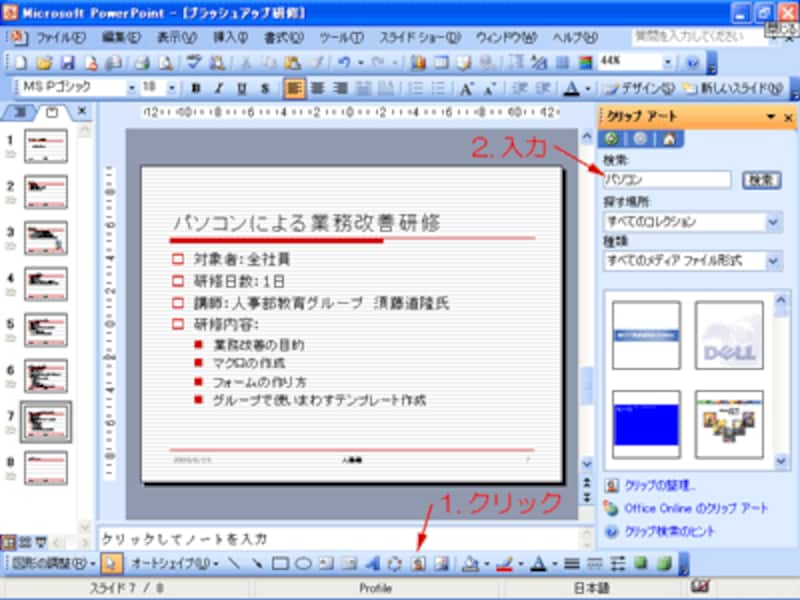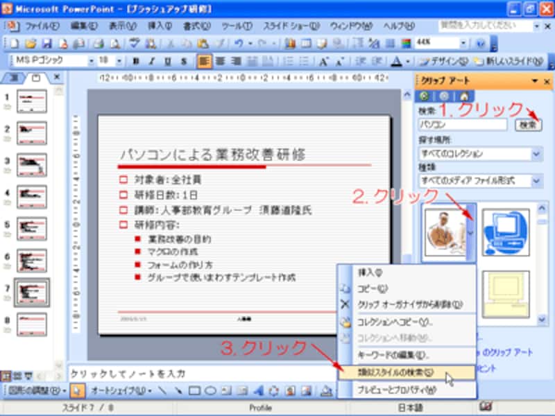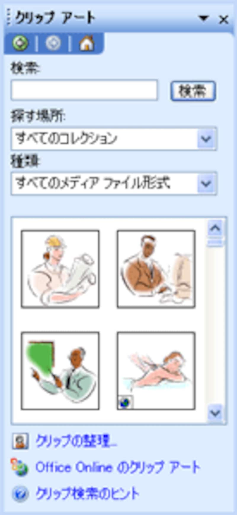 PowerPointに付属する「クリップアート」には、「類似スタイルの検索」機能があります。この機能を使うと、同じテイストのイラストを簡単に探し出せるので覚えておくと便利です。「図形描画」ツールバーの「クリップアートの挿入」ボタンをクリックし、画面右側に表示された「クリップアートの作業」ウィンドウにキーワードを入力します。