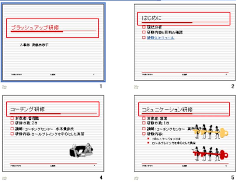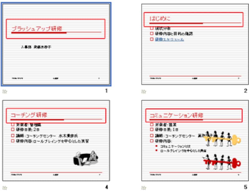 「スライドマスタ表示」ツールバーの「マスタ表示を閉じる」ボタンをクリックして、通常のスライドに戻ると、表紙のスライドもそれ以外のスライドも、タイトルの文字が赤くなっているのを確認できます。