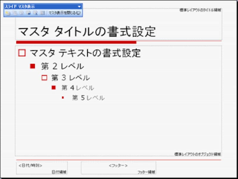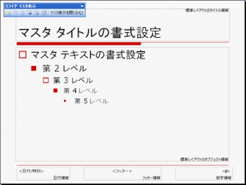 マスタ画面の下部の「フッター」と呼ばれる領域には、日付や時刻を表示するプレースホルダ(日付領域)や、スライド番号を表示するプレースホルダ(数字領域)などが用意されています。不用なプレースホルダがある場合は、外枠をクリックして選択してから「Delete」キーを押すだけで削除できます。