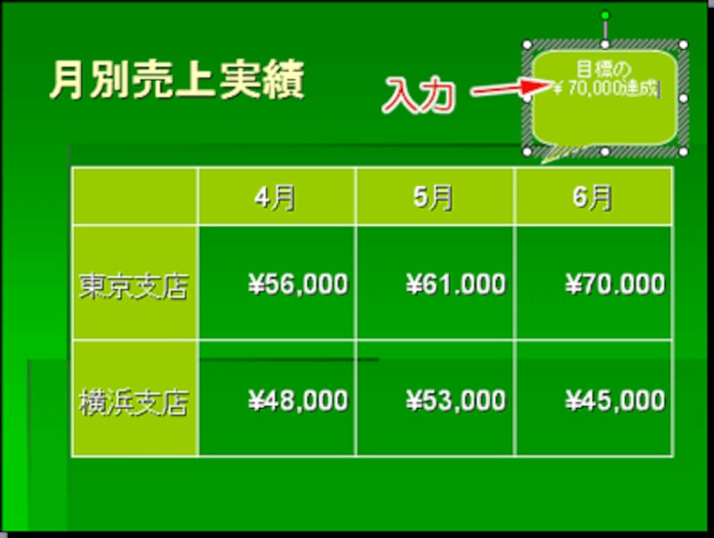 まず、下の表を見てください。この表を見たときに、ある人は「東京支店の順調な伸び」に注目し、ある人は「横浜支店の6月の落ち込み」に注目するかもしれません。発表者が伝えたいポイントを正しく理解してもらうには、ポイントをスライド内に書き加える一手間が必要です。![]() |