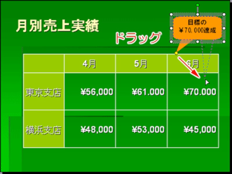 また、図形の周りに表示されている白いハンドルをドラッグして図形のサイズが調整したり、図形をドラッグして位置を調整しておきましょう。特に、吹き出し口がどこを向いているかは重要です。吹き出し口の先頭にある黄色いひし形のハンドルをドラッグして、吹き出し口の位置を調整します。