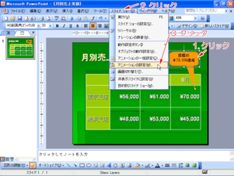 吹き出しの図形が完成したら、いよいよアニメーションの出番です。図形が選択されていることを確認し、「スライドショー」メニューから「アニメーションの設定」をクリックします。