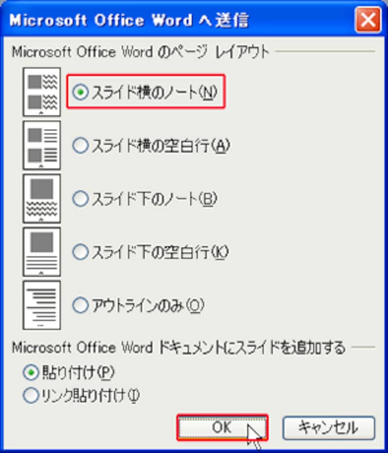 ただし、「スライド下のノート」では、PowerPointでノートを印刷した形式と同じです。「虎の巻」をコンパクトにするには、「スライド横のノート」をクリックして選択し、「OK」ボタンをクリックします。