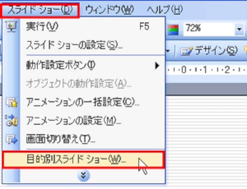 準備ができたら、「スライドショー」メニューから「目的別スライドショー」をクリックします。