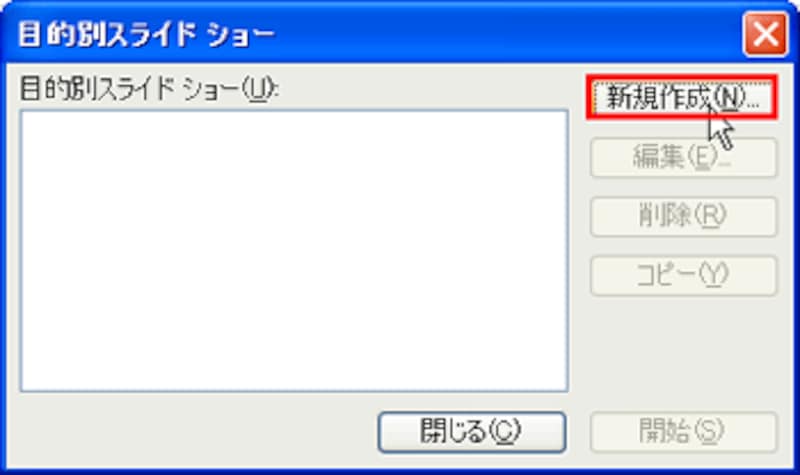 「目的別スライドショー」ダイアログボックスが表示されたら「新規作成」ボタンをクリックし、新しい目的別スライドショーを作成します。