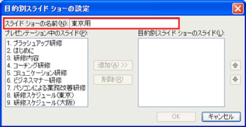 「目的別スライドショーの設定」ダイアログボックスが表示されたら、「スライドショーの名前」欄に「東京用」と入力します。