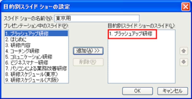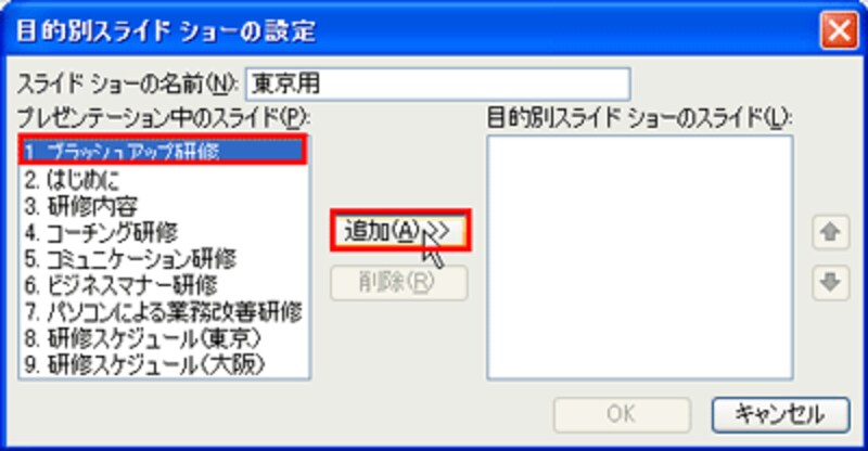 続いて、左側の「プレゼンテーション中のスライド」から「東京用」に必要なスライドをクリックして選択し、中央の「追加」ボタンをクリックします。そうすると、選択したスライドが右側の「目的別スライドショーのスライド」に表示されます。