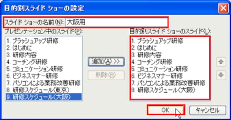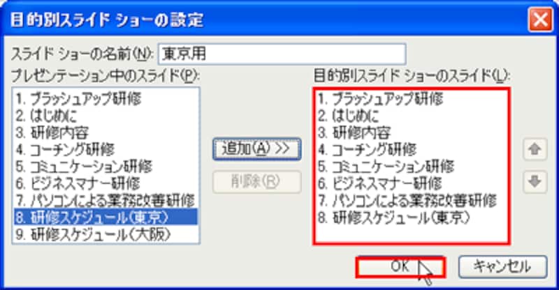 この操作を繰り返して、必要なスライドをすべて選択し、最後に「OK」ボタンをクリックします。これだけで、「東京用」のプレゼンパターンが登録できました。