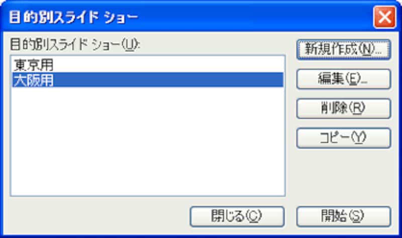 「目的別スライドショー」ダイアログボックスに戻ったら、「新規作成」ボタンをクリックし、「東京用」を作成したのと同じ手順で「大阪用」のプレゼンパターンを作成します。