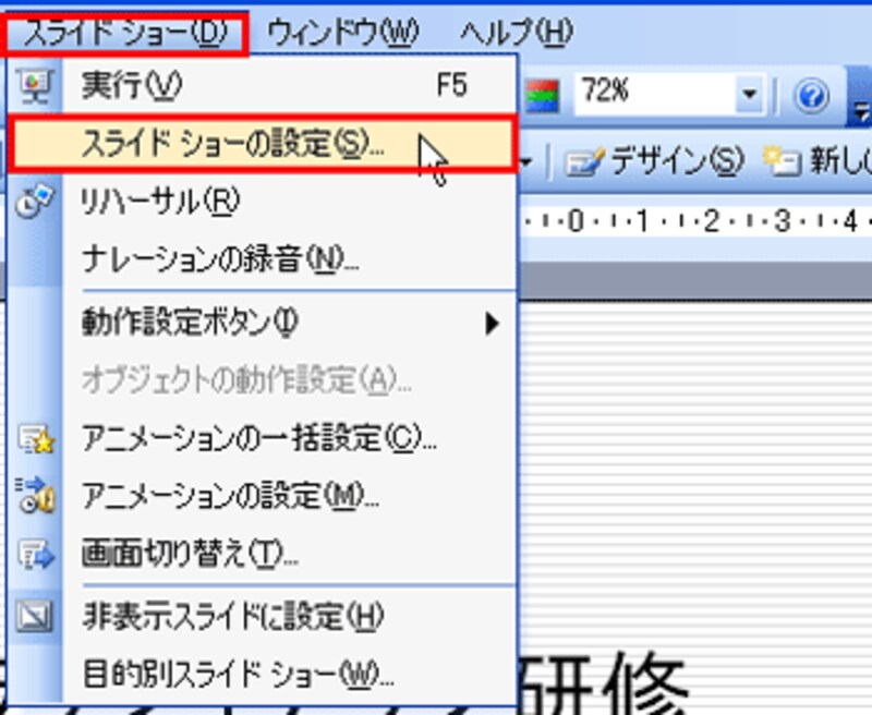 あらかじめ、実行する目的別スライドショーを指定しておく方法です。「スライドショー」メニューから「スライドショーの設定」をクリックします。