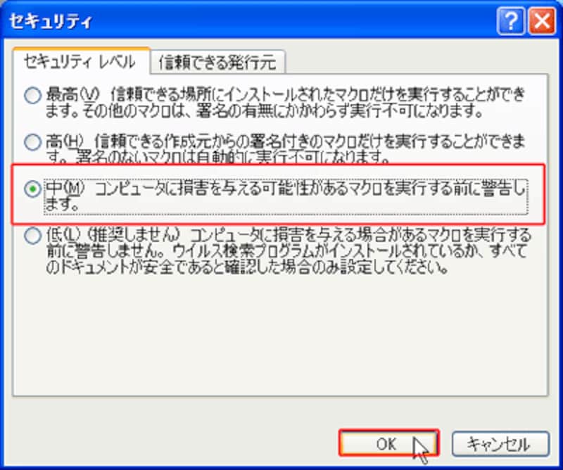 「セキュリティ」画面」の「セキュリティレベル」タブでは、最初は「高」が設定されているはずです。これは、信頼できる作成元からの署名がないとマクロが使えないという設定です。マクロを作成したり実行したりするためには「中」に変更しておきましょう。