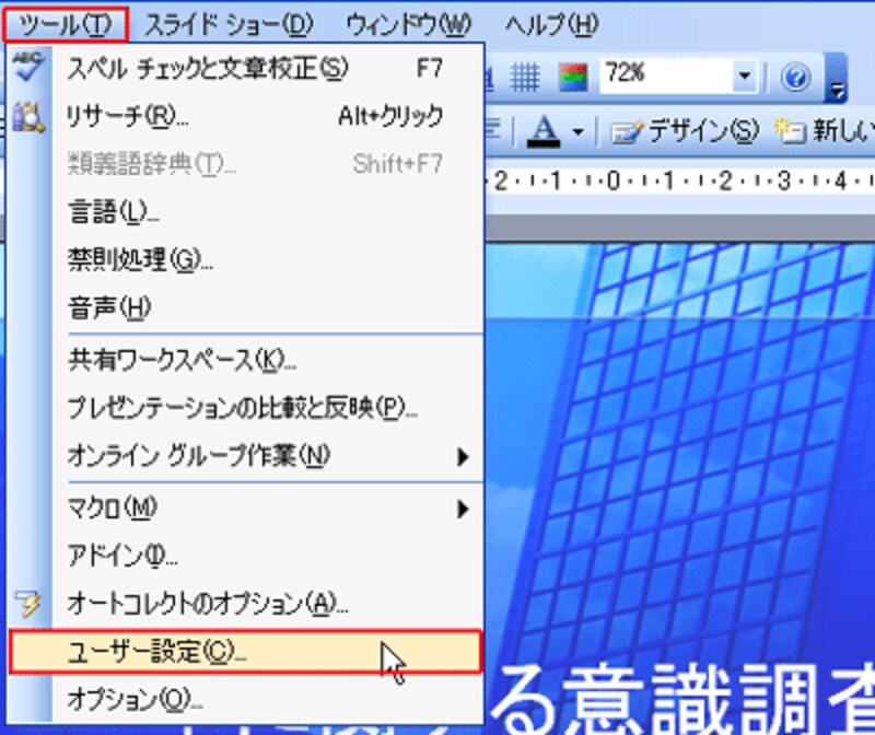 作成済みのマクロを登録するための専用のツールバーを作成します。「ツール」メニューの「ユーザー設定」をクリックします。|  |