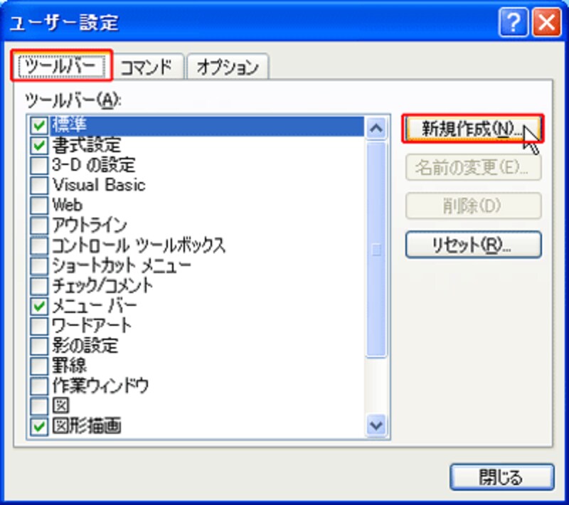 「ユーザー設定」画面の「ツールバー」タブにある「新規作成」ボタンをクリックします。