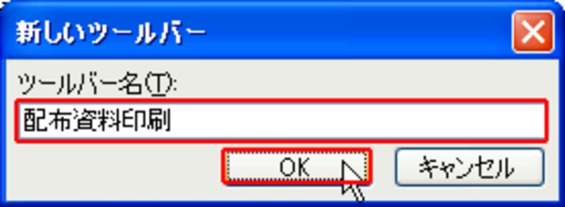 「新しいツールバー」画面が表示されたら、ツールバーの名前を入力して「OK」ボタンをクリックします。ここでは、「配布資料印刷」という名前にしました。
