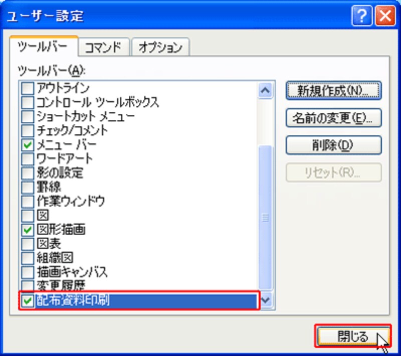 「ユーザー設定」画面に戻ると、左側のツールバーの一覧の一番下に、作成した新しいツールバーの名前が表示されていることが確認できます。「閉じる」ボタンをクリックすると、スライド上に「配布資料印刷」ツールバーが表示されます。