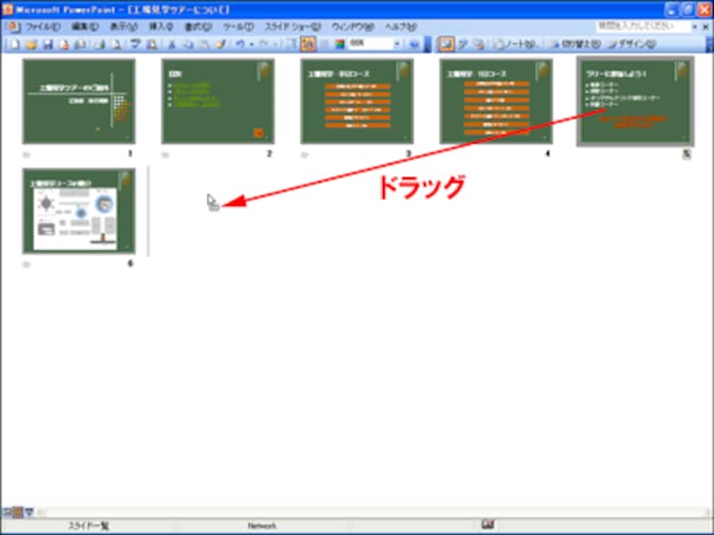 非表示スライドに設定したスライドを一番最後にドラッグして移動します。スライドマスタで設定したスライド番号は自動的に更新されるため、連続したスライド番号に自動的に振り直されます。