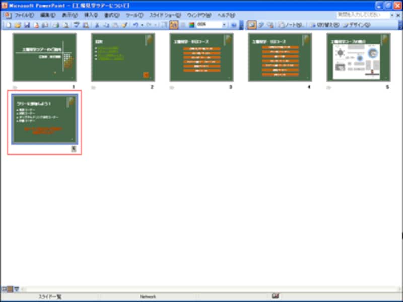 | PowerPoint2007では、「表示」タブの「スライド一覧」ボタンをクリックして切り替える |