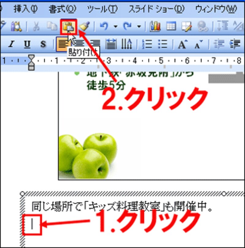 次に、コピー先のファイルに切り替え、ノート表示モードのノート部分をクリックします。ツールバーの「貼り付け」ボタンをクリックすると、スライドを画像として貼り付けることができます。