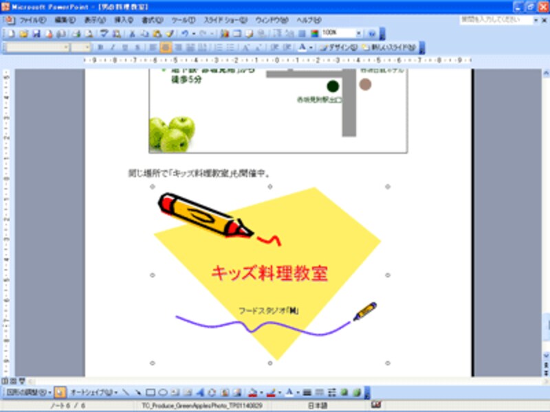 | ノートにスライドごと貼り付いた。貼り付いた画像をドラッグすると移動できる。また、四隅のハンドルをドラッグしてサイズ調整も可能だ |
