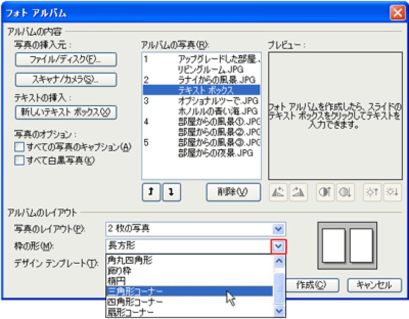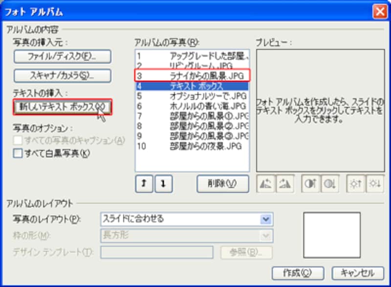 写真にコメントを追加したければ、最初に写真を選択してから「新しいテキストボックス」ボタンをクリックします。そうすると、中央の「アルバムの写真」に「テキストボックス」という名前が追加され、フォトアルバム作成後にコメントを入力できりようになります。
