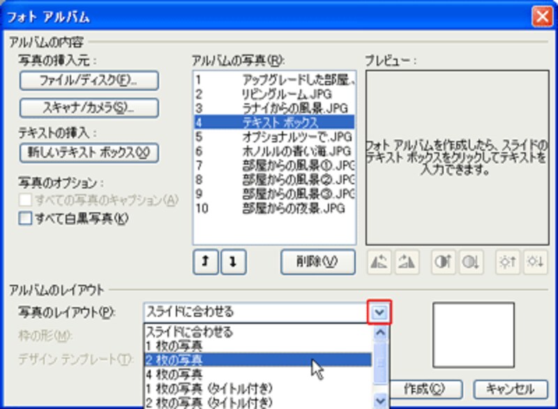 2番目の作業は、写真のレイアウトを決める作業です。これは、スライド1枚に配置する写真の数を決める作業のこと。「写真のレイアウト」の右横の▼ボタンをクリックすると、PowerPointに用意されているレイアウトの一覧が表示されます。「スライドに合わせる」を選ぶと、スライド全体を使って大きく写真を配置します。