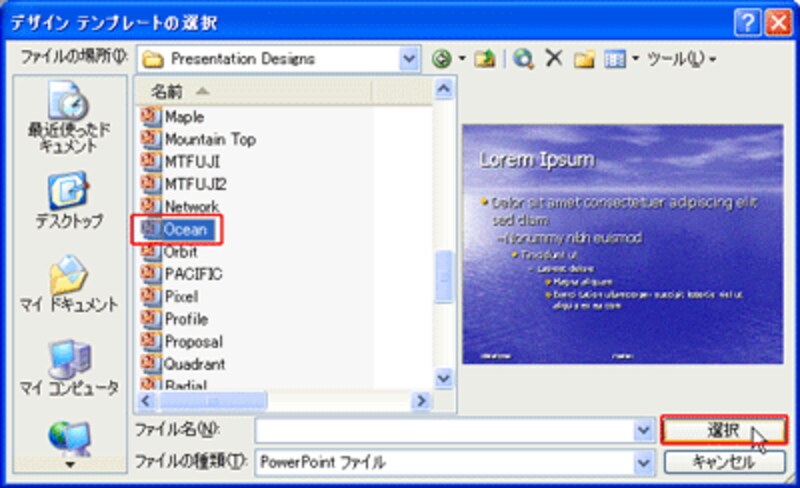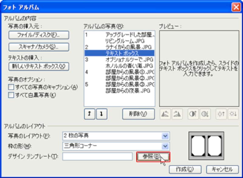 「デザインテンプレート」の右横の「参照」ボタンをクリックし、「デザインテンプレートの適用」画面でスライドのデザインを選べばOKです。できるだけシンプルなデザインを選んだほうが写真が映えます。