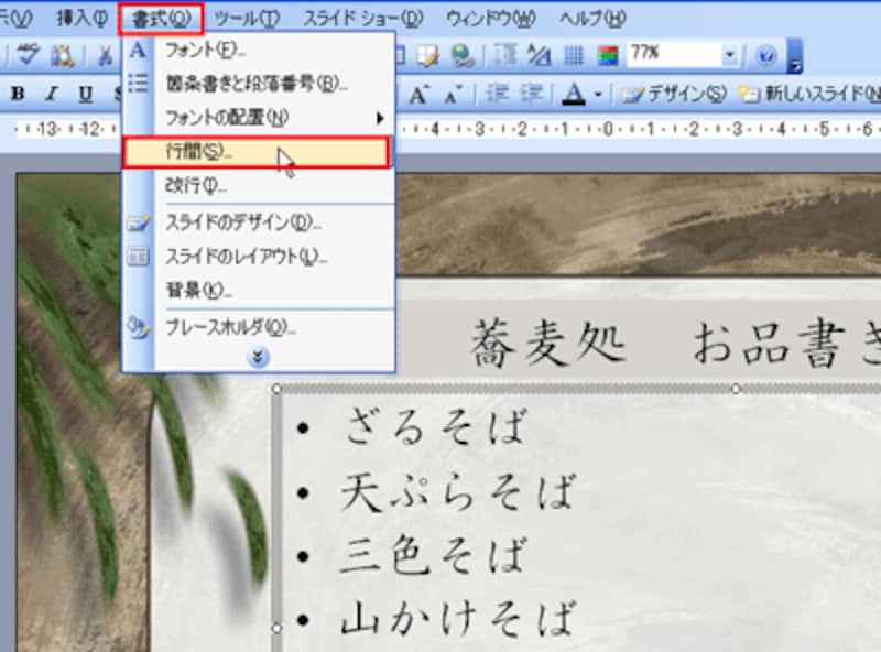 箇条書きのプレースホルダをクリックして箇条書き全体を選択し、「書式」メニューから「行間」をクリックします。
